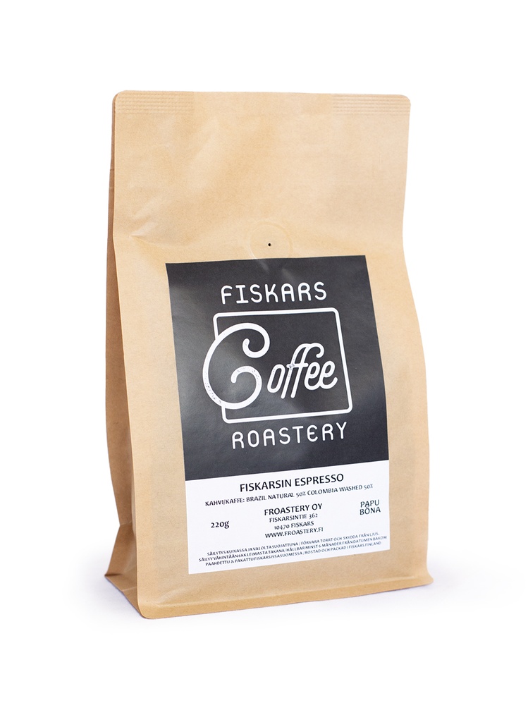 Fiskarsin Espresso on 100% Arabica ja papuina on käytetty Brazil Natural 50%, Colombia Washed 50%
